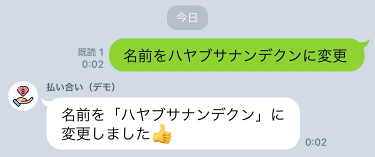 名前を変更できるようになりました haraiai をご利用の LINE グループにて、登録した名前(ニックネーム)を変更できるようになりました。 名前を変更したい方は、「名前を○○に変更」と言ってみてください。